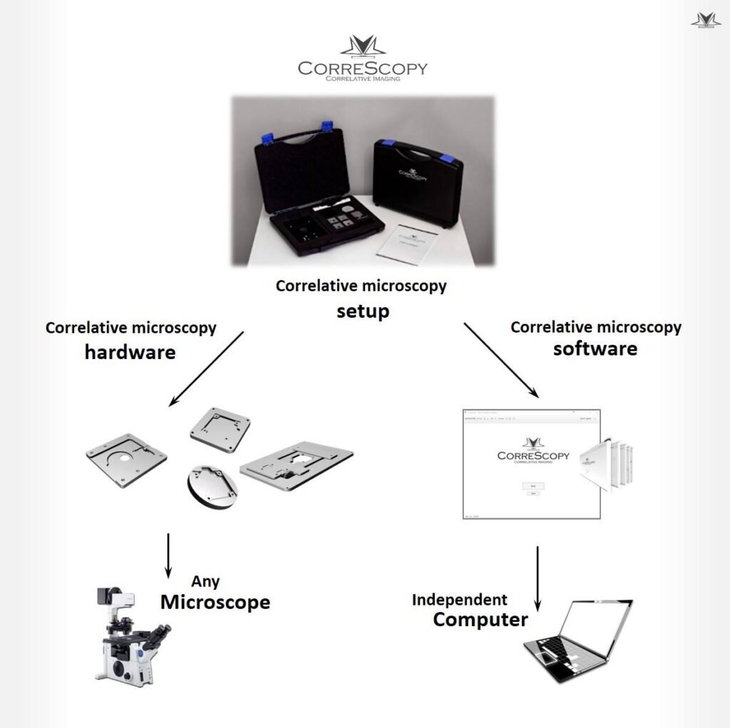 - Compatibilidad con cualquier microscopio: Correscopy se puede utilizar con cualquier microscopio existente en un laboratorio, independientemente de la marca o la técnica de imagen (excepto la Microscopía Electrónica de Transmisión, TEM).